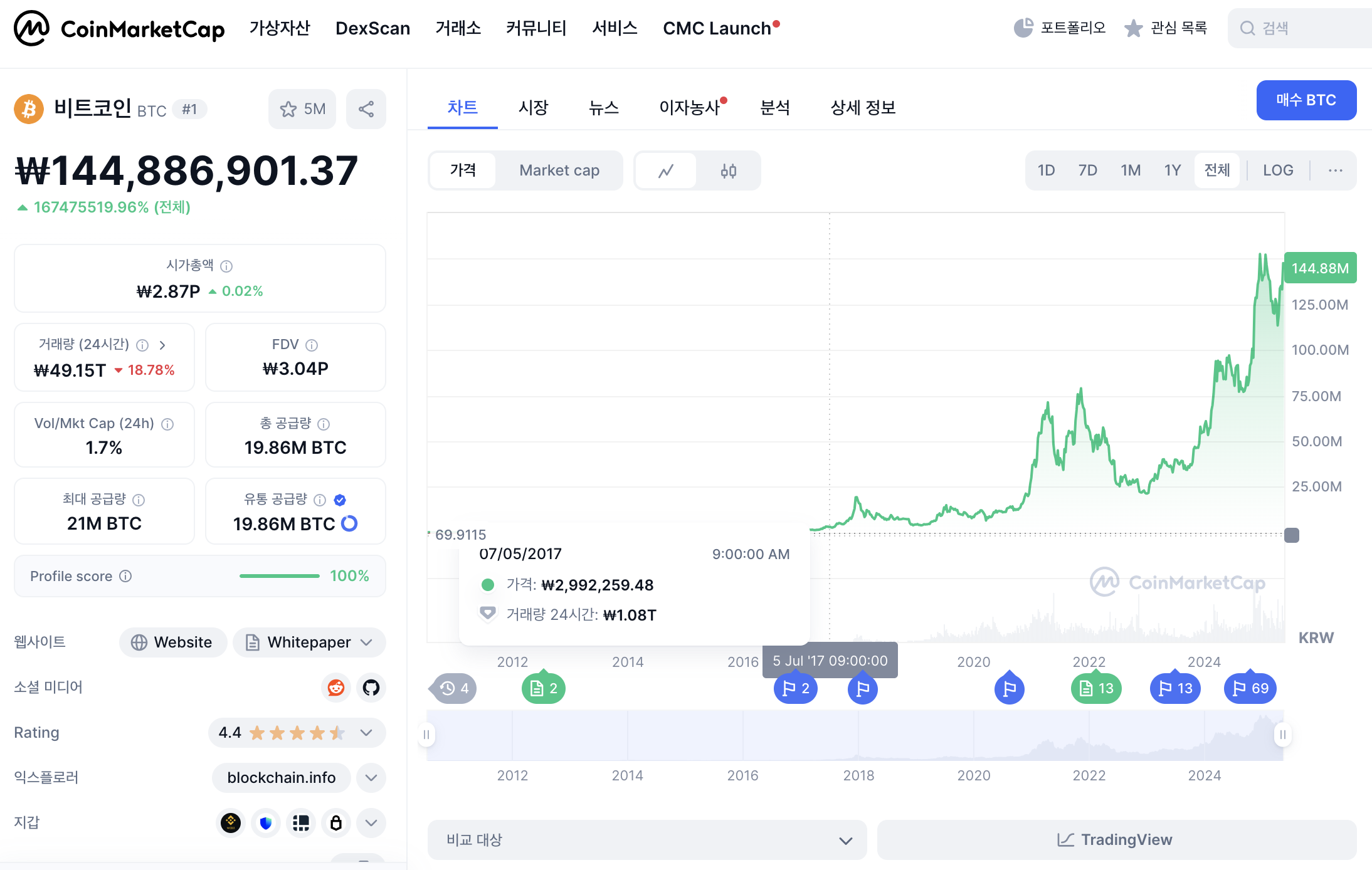 첨부한 그림은 2017년도 300만 원에서 2025년 현재 1억 4천만 원을 돌파한 비트코인 가격변화를 보여주는 그래프입니다.